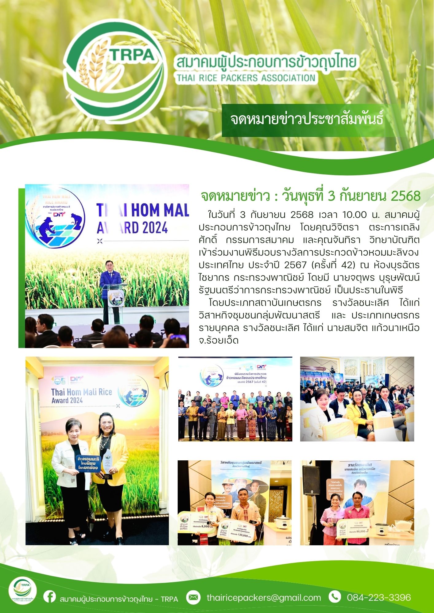 >>>>>ในวันที่ 3 กันยายน 2568 เวลา 10.00 น. สมาคมผู้ประกอบการข้าวถุงไทย โดยคุณวิจิตรา ตระการเถลิงศักดิ์ กรรมการสมาคม และคุณจันทิรา วิทยาบัณฑิต เข้าร่วมงานพิธีมอบรางวัลการประกวดข้าวหอมมะลิของประเทศไทย ประจำปี 2567 (ครั้งที่ 42) ณ ห้องบุรฉัตรไชยากร กระทรวงพาณิชย์ โดยมี นายจตุพร บุรุษพัฒน์ รัฐมนตรีว่าการกระทรวงพาณิชย์ เป็นประธานในพิธี
